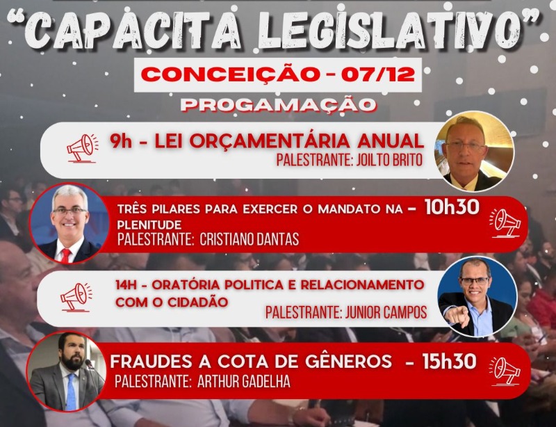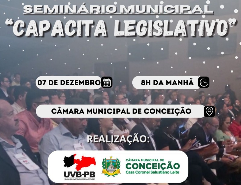 A câmara municipal de Conceição, em parceria com a União dos Vereadores da Paraíba (UVB-PB) vai realizar na próxima quinta-feira (7) o seminário municipal “Capacita Legislativo. O evento é voltado para a capacitação não só dos vereadores da câmara de Conceição, mas para todos os vereadores da região que desejarem participar.