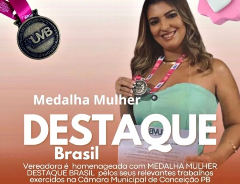 A vereadora Thalita Meneses, da Câmara municipal de Conceição, recebeu a medalha Mulher Destaque Brasil, que é destinada às mulheres atuantes na política e que se destacam nos seus mandatos. A medalha foi entregue durante o Fórum Nacional da Mulher Parlamentar, que por sua vez aconteceu durante o Encontro Nacional de Gestores e Legislativos, em João Pessoa.